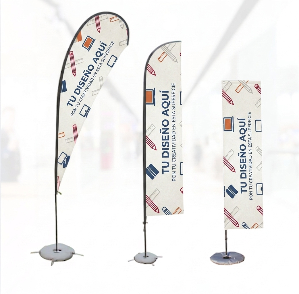 - Banderolas Gota : con su forma característica y aerodinámica, son perfectas para transmitir elegancia y modernidad. Su diseño evita enredos, manteniendo siempre visible tu publicidad.